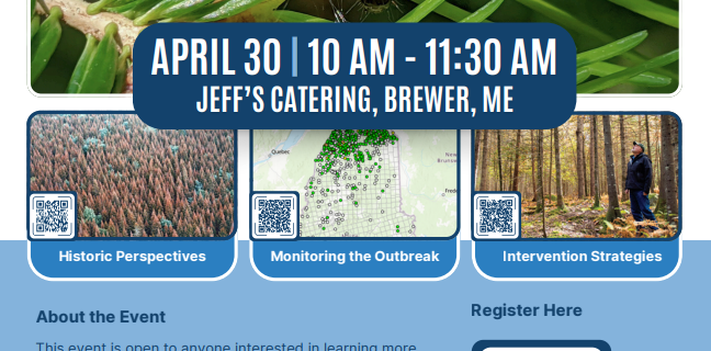 Spruce Budworm Public Information Session Date: Thursday, April 30, 2026Time: 10:00AM to 11:30AMLocation: Jeff's Catering, 15 Littlefield Rd, Brewer, Maine 04412Cost: Free Keeping Maine's Forest is hosting a Spruce Budworm Public Information Session to provide a platform for education and discussion regarding the spruce budworm outbreak affecting our state's forests. Attendees will have the opportunity to hear from expert speakers representing the Maine Forest Service, the University of ... Read More ›