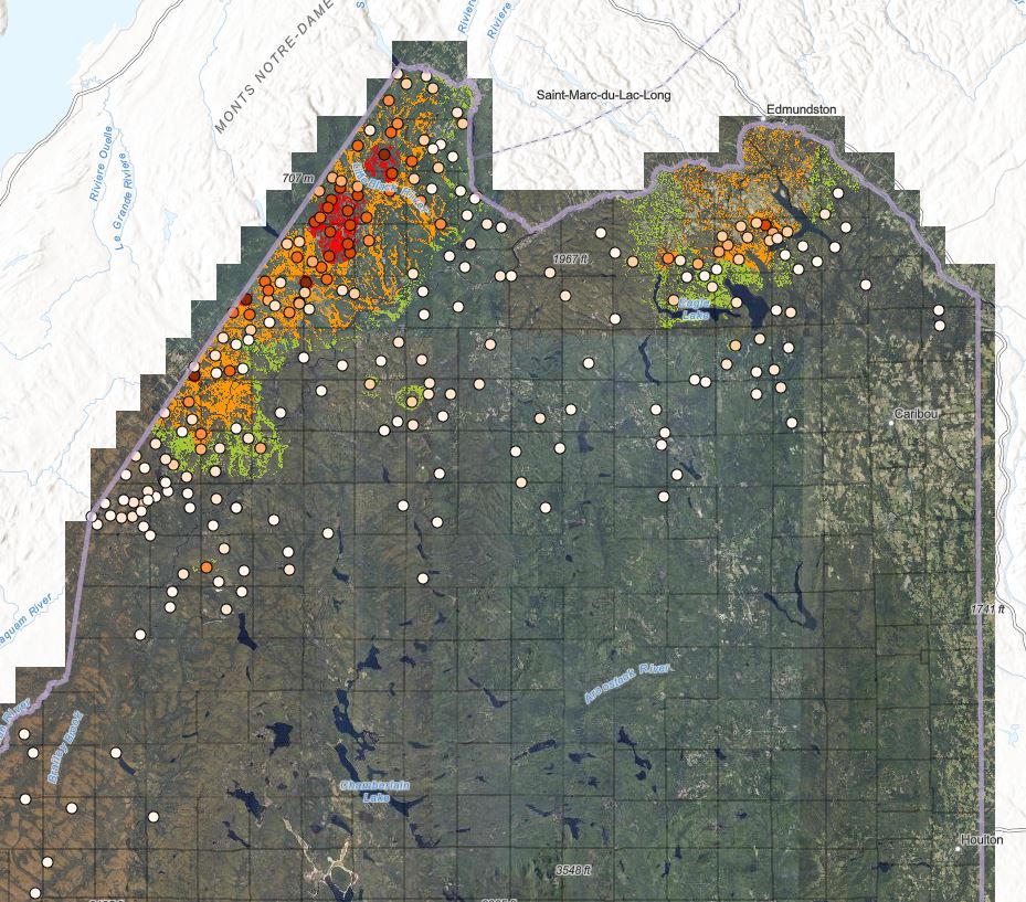 Because the spruce budworm outbreak will have a substantial impact on forest composition and structure over large areas, the next outbreak will likely have an influence on wildlife habitat over a long period of time. For example, mature spruce-fir stands are vital to deer wintering areas (DWA), so a decrease in DWA areas due to an SBW outbreak are likely to lead to higher winter mortality in deer (as well as impact other species associated with mature, softwood-dominated canopies such as Canada lynx). Although insecticide spraying for SBW will have little or no direct impact on lynx, snowshoe hare, or moose. That being said, snowshoe hare need cover from predators, which is best provided by regenerating young softwoods (15 to 40 years old). The interface between mature timber and regenerating softwood stands may facilitate the ability of Canada lynx to hunt snowshoe hares. On the plus side for moose, if areas are heavily salvage logged, the increased area of early successional habitat will increase available moose browse.