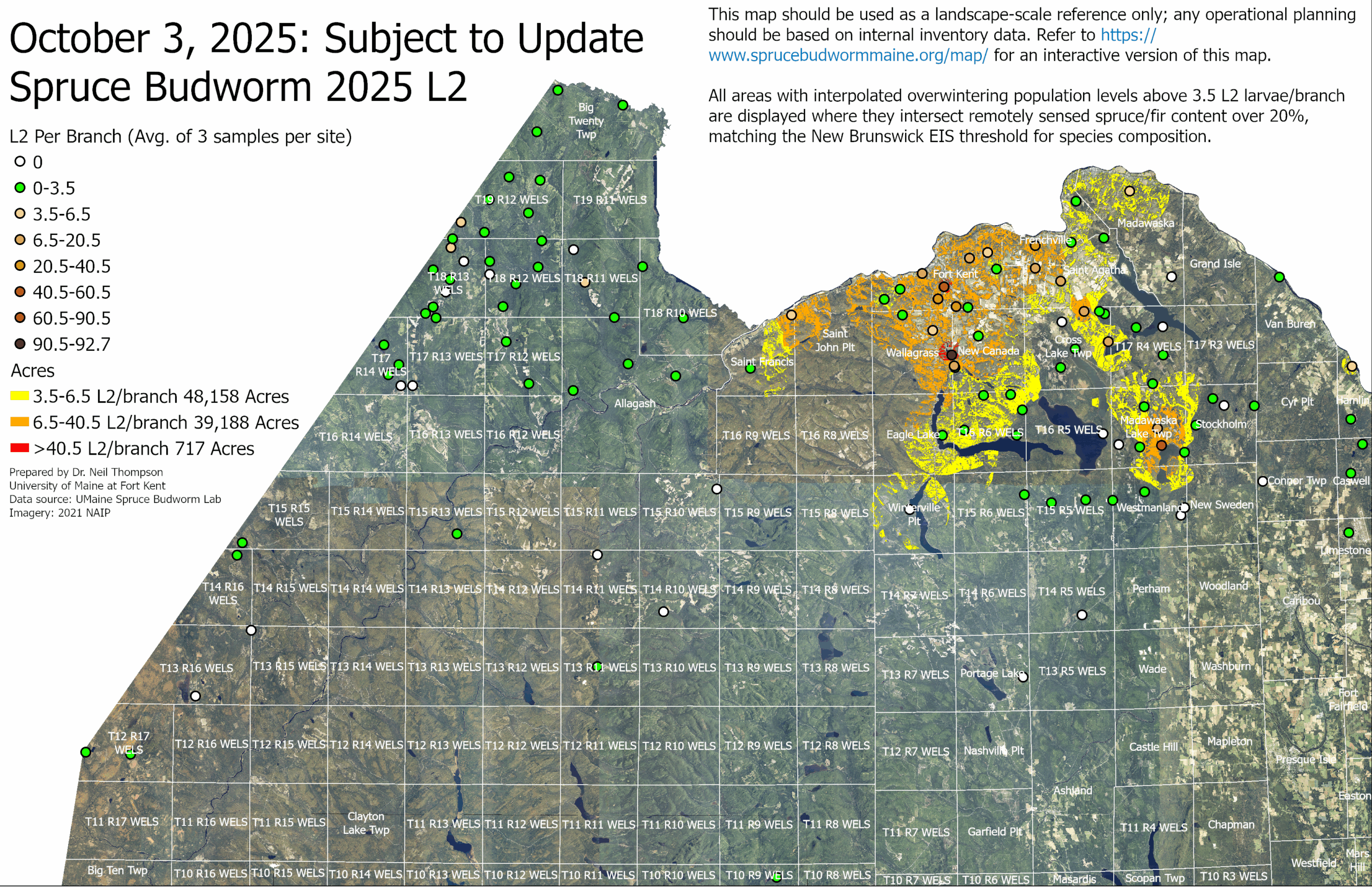 The UMaine Spruce Budworm Lab at the University of Maine is currently supported by the Cooperative Forestry Research Unit (CFRU) program and the U.S. Forest Service. To predict SBW populations for the following year, tree branch samples are collected in the fall and submitted to the Spruce Budworm Lab. The Lab processes the branch samples and counts the overwintering stage of SBW, better known as an L2. L2 counts and models will be updated weekly until all samples for the season have been processed.